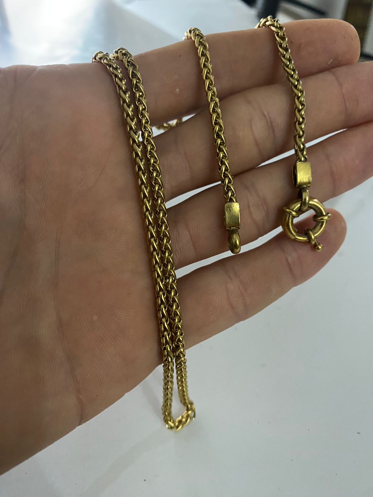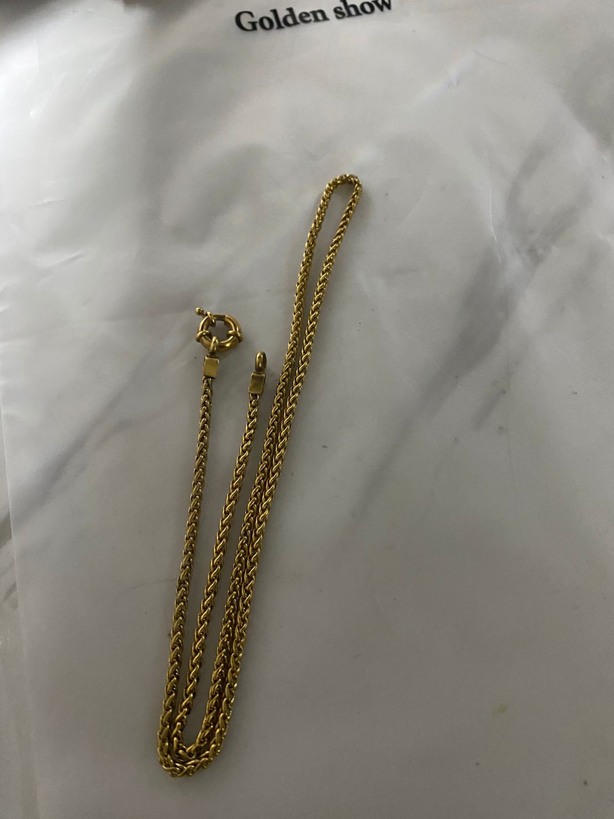 Su diseño de eslabones en espiga ofrece una textura delicada y un acabado impecable, que suma elegancia sin perder la sutileza de una cadena fina. El enchapado en oro de 18 quilates asegura un brillo intenso y una resistencia superior al desgaste, manteniendo su belleza a lo largo del tiempo.